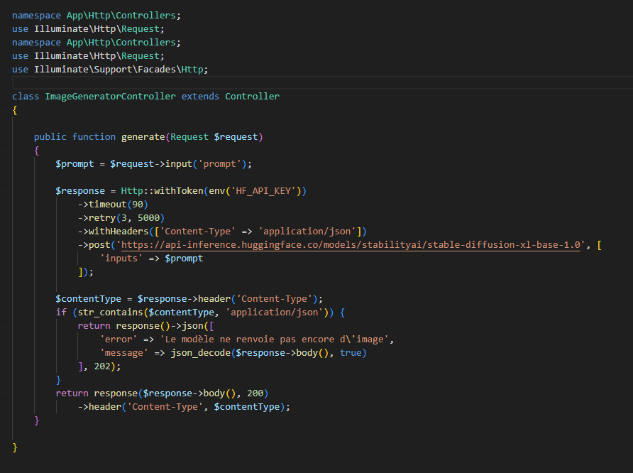 Techniquement, c'est un simple appel à l'API d'Hugging Face. Vous utilisez un modèle comme stabilityai/stable-diffusion-xl-base-1.0, vous envoyez un prompt, vous récupérez l'image. Coté Laravel (ou Symfony, Node.js, Go...), c'est une requête HTTP POST classique.