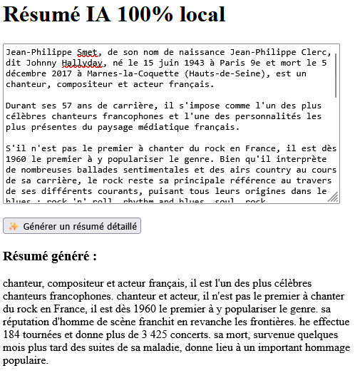 Note importante : le modèle utilisé (T5-base) n'est pas spécifiquement entraîné sur le français. Il comprend très bien la langue, mais il peut parfois glisser des mots anglais dans le résumé — des petites surprises comme "chit" ou "he effectue" peuvent apparaître. Cela reste rare, mais c’est le genre de comportement à garder en tête, surtout pour une intégration en production. Des modèles francophones existent sur Hugging Face, mais ils ne sont pas encore compatibles avec l'exécution dans le navigateur via Xenova/transformers.